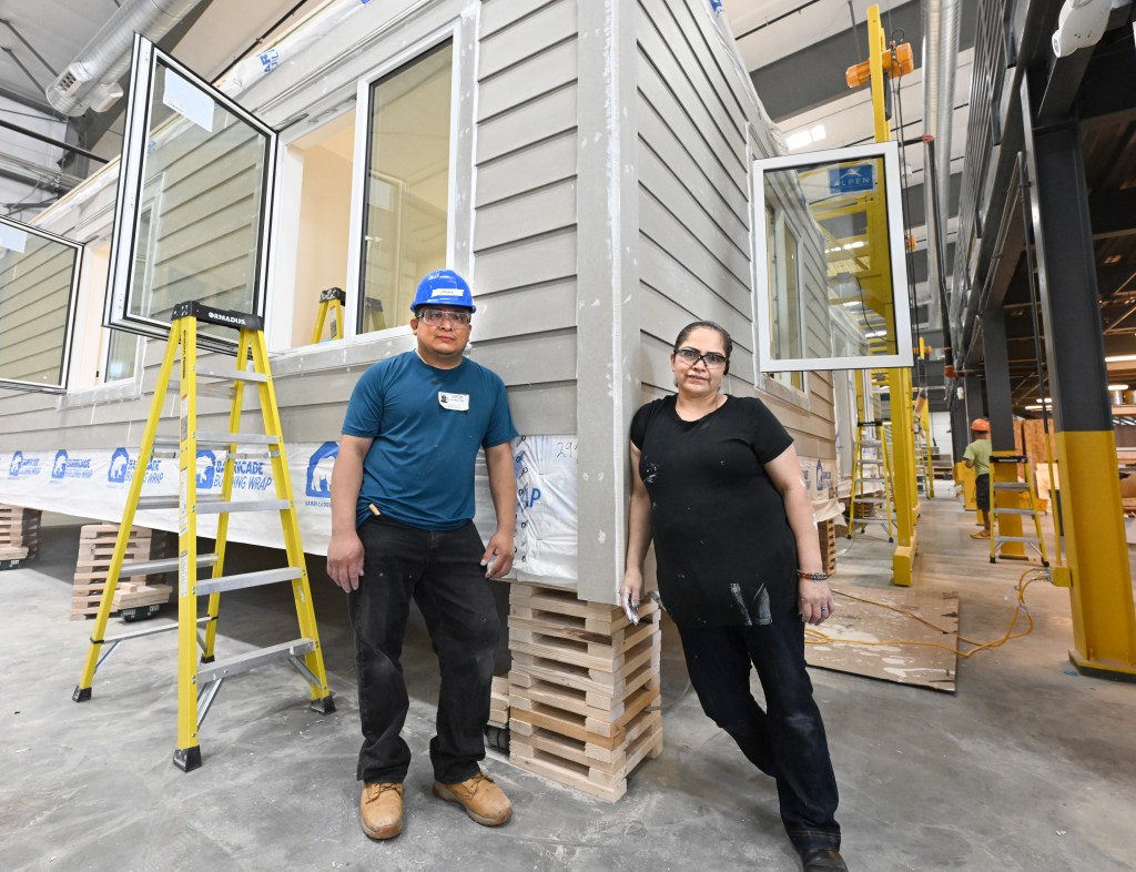 The factory is producing all-electric, solar-powered and affordable modular townhomes. Each townhome-style unit houses two families.