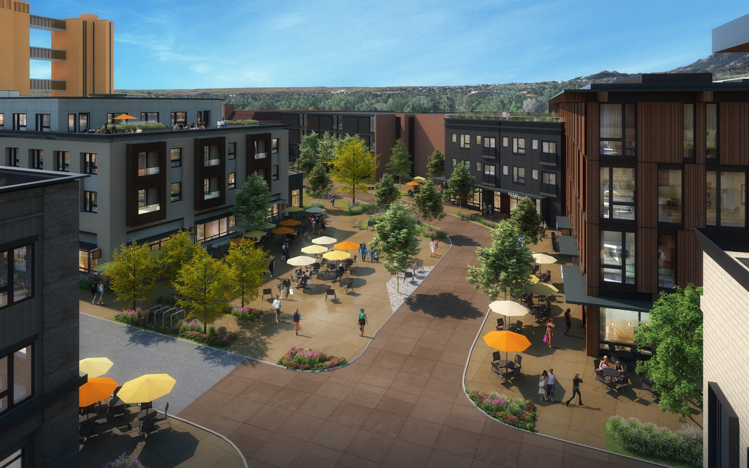 Trees, parks, plazas and rooftop decks would be located throughout the development, according to development plans. A village green is located at the center of the site and is intended to be used for community events, according to the project team. The buildings would include brickwork with metal accents as well as composite and wood siding. The buildings are designed to look different, with varying heights and deep recesses throughout partially intended to help reduce car noise from US 36.
